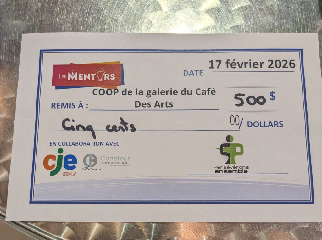 C’est avec beaucoup de fierté que les jeunes représentants de la Coop de la Galerie du Café des Arts ont remporté une bourse de 500 $ lors de la Soirée des mentors, tenue le mardi 17 février 2026.
