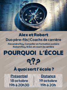 C’est pourquoi vous êtes invité(e) à notre conférence du mercredi 18 octobre 2023 qui a pour thème : « Pourquoi l’école ». Cette dernière se tiendra à la Salle Turner de l’école secondaire d’Oka de 19h à 20h30.